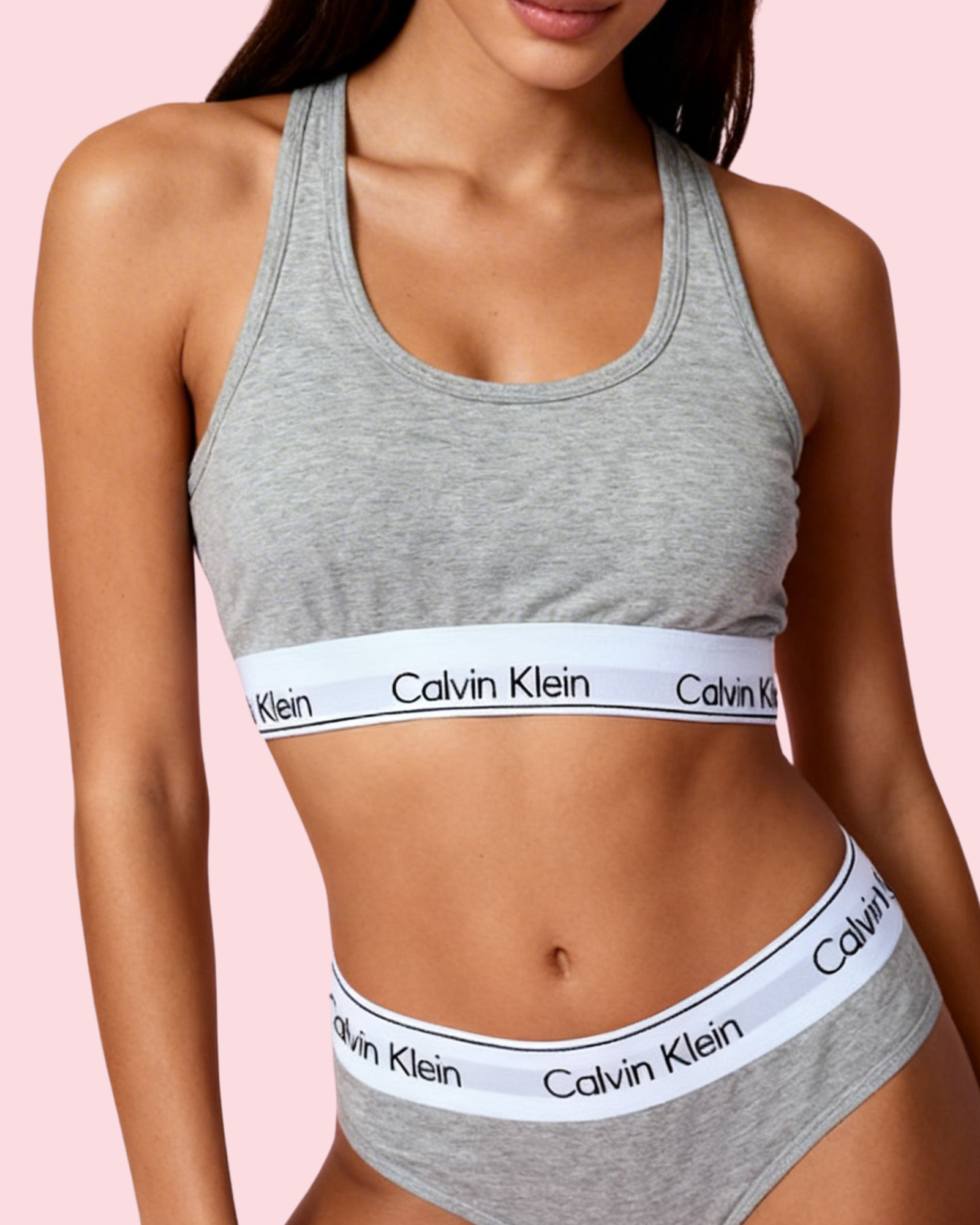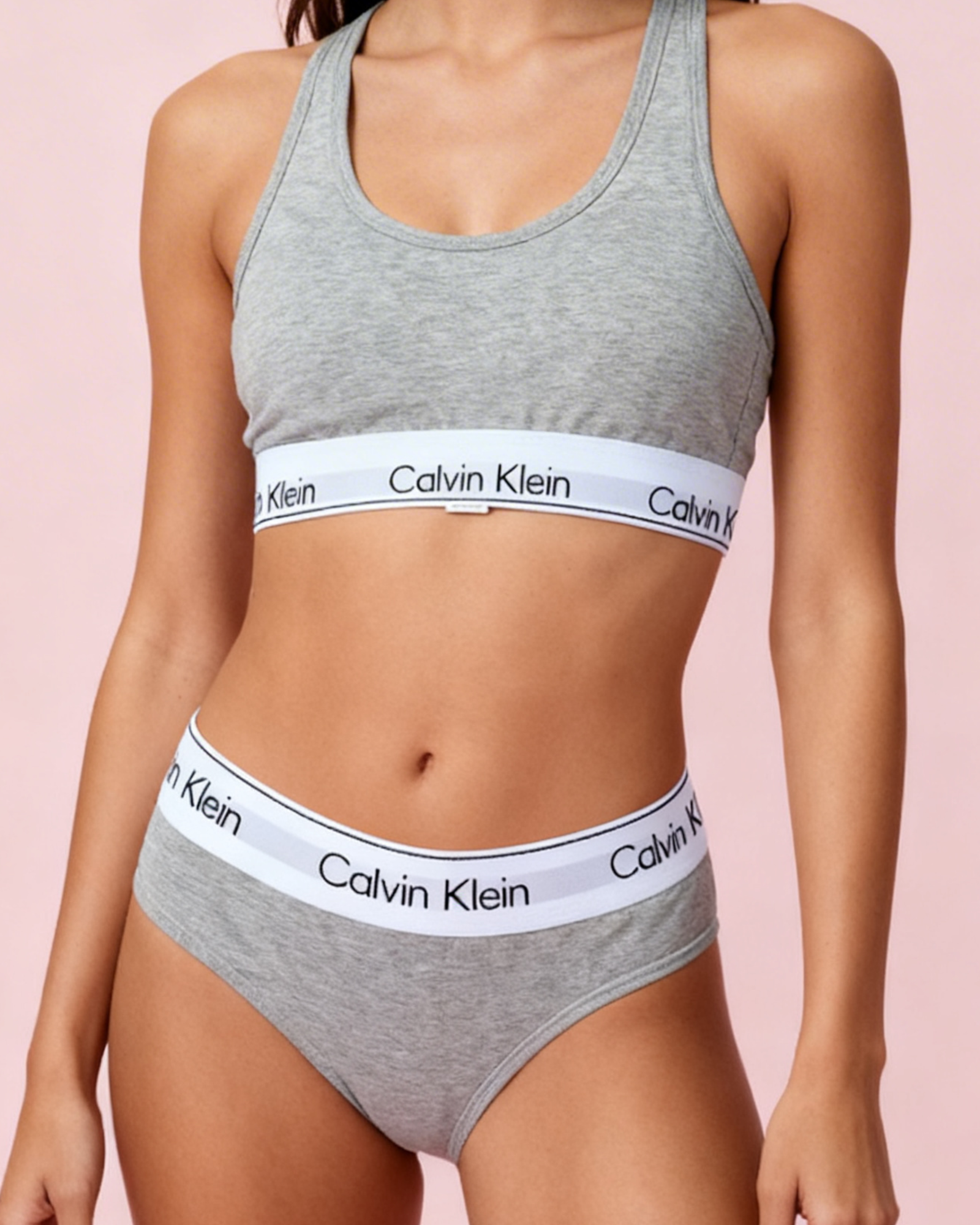 Siente la suavidad definitiva con este conjunto clásico de Calvin Klein en color gris jaspeado. Diseñado para ofrecer soporte y comodidad sin esfuerzo, este set combina el icónico estilo deportivo con una elegancia minimalista perfecta para el uso diario o para relajarte en casa.
